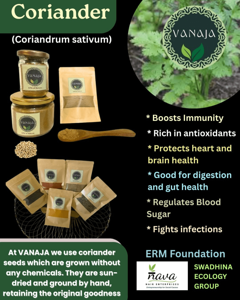 3. Indian Spices : Coriander ( Coriandrum sativum )/Dhaniya: Coriander plant was introduced to India by traders from the Mediterranean and Middle East region . Today India is one of the leading producers of Coriander in the world . It is a versatile plant that is extensively used in Indian cuisine. Coriander leaves are used as key ingredients in many dishes and is also used for garnishing . Coriander seeds are used as a whole spice and in powdered form . It has vast benefits . It boosts immunity , is rich in antioxidants, protects heart and brain health and regulates blood sugar . It is also good for digestion and gut health and fights infections. At Vanaja we use Coriander seeds which are grown without any chemicals . They are sun dried and ground by hand , retaining the original goodness .