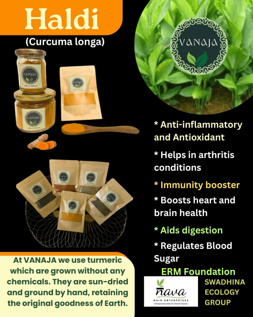 1. Indian Spices : Turmeric (Curcuma longa)/Haldi: Turmeric is one of the most-loved spices in Indian kitchen. The usage of Turmeric dates back to 4000 years during the time of the ancient Vedas.. It was used for Culinary needs , for medicinal purposes and also for religious use . Turmeric that we use as a spice is obtained from Curcuma Longa plant . It has been used to add colour and flavour to food as well as to enhance the nutritional properties since it has very good medicinal properties as well . It is anti inflammatory and anti oxidant. This is the reason it is known to ease inflammations and in arthritis conditions . It is a huge immunity booster and helps in supporting heart and brain health . One of the prime benefits is that it aids digestion . It is also known to regulate blood sugar . Turmeric is also widely used for skin radiance as it give brighter skin and prevents acne since it has antioxidant called Curcumin . It also reduces skin inflammation . It is a popular home remedy for skin problems . However , much of the properties could be a negated with the usage of chemical fertilizer to grow this herb . At Vanaja the Turmeric obtained is free of any chemicals . Only organic manure is used to preserve its natural goodness . It is sundried and hand pounded to preserve its nutritional value . You can buy Turmeric powder from Vanaja and add to your good health .