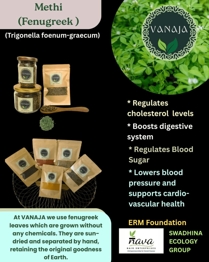 4. Indian Spices – Fenugreek (Trigonella foenum- graecum ) /Methi: Fenugreek originated in South Eastern Europe and the Mediterranean region . In India it is one of the most popular spices where the leaves as well as the seeds are widely used . It is a key medicinal plant where Fenugreek or methi seeds are used for several health benefits . It regulates cholesterol level , regulates blood sugar and boosts digestive system . It also lowers blood pressure and supports cardio vascular health . At Vanaja we provide dried Fenugreek leaves and seeds which are grown in our organic farms without any chemical usage . They are Sun Dried and separated by hand. Use Methi seeds and leaves from Vanaja for excellent taste flavour and good health .