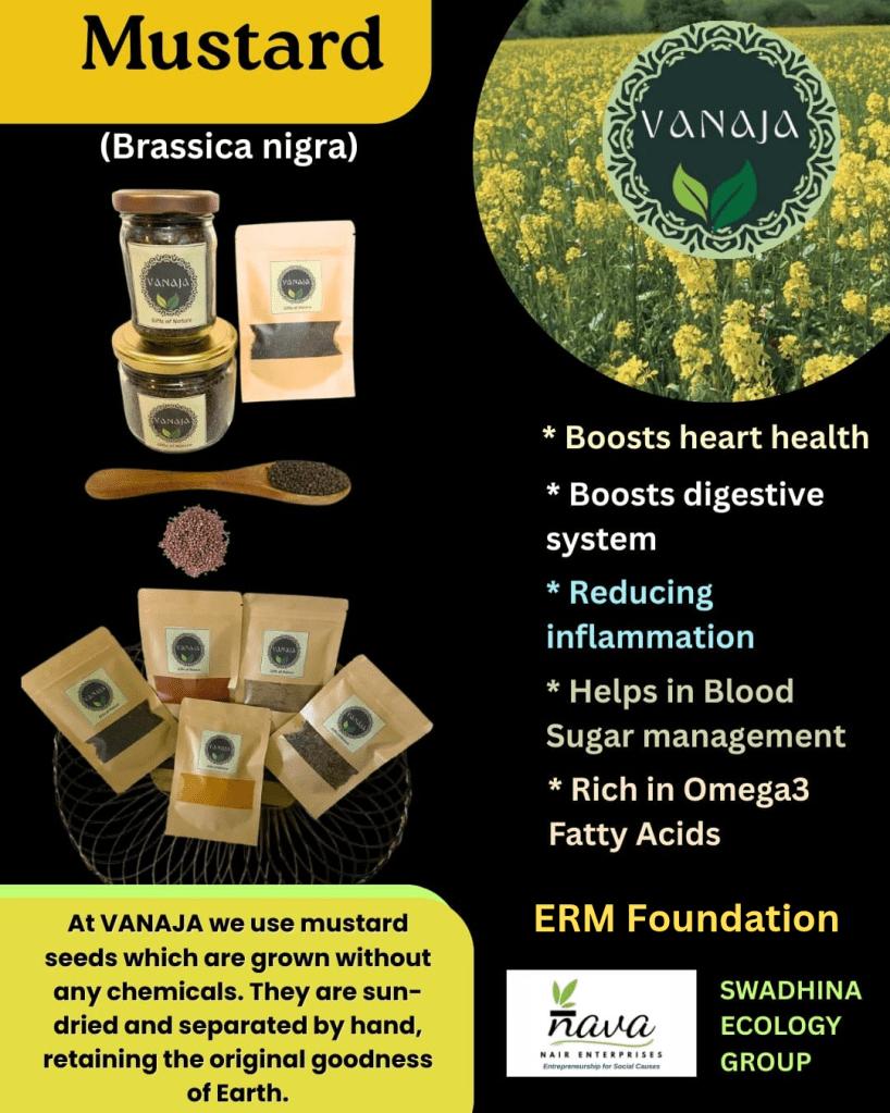 5. Indian spices : Mustard ( Brassica nigra)/Sarson: Mustard is a plant native to India , the origin of which can be dated back to Indus Valley Civilisation around 2500 BCE . Mustard seeds are a powerhouse of earthy goodness . The seeds are used to extract oil as well as in cooked Indian dishes as whole seeds or pastes . They are known to add heat to the dish . Mustard has properties that boost heart health and digestive system , reduce inflammation, help in blood sugar management . Mustard is rich in omega 3 fatty acids . At Vanaja we use mustard seeds grown in our organic farms in the most natural way and are sun dried and cleaned by hand .