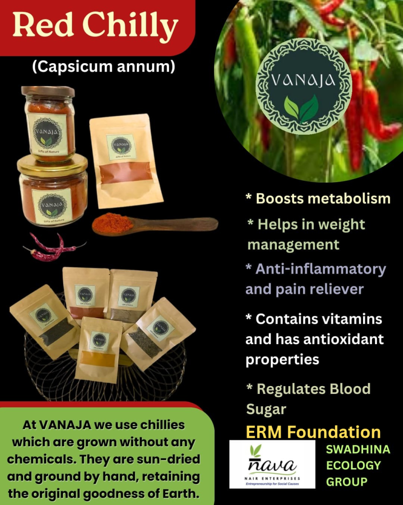 2. Indian Spices : Red Chillies ( Capsicum Annum)/ Laal Mirch: We can hardly think of Indian cuisine without the use of chillies . Red chillies , among the different variety of chilly present one of the most popular form of spices – used both as whole spices as well as powdered spices .It may be surprising to note that even though India is among the largest consumers as well as suppliers of red chillies , the spice is not native to the Indian soil and were introduced by the Portuguese . Red Chillies have a wide variety of uses . Red Chillies are an immense booster of metabolism. They help in weight management . They are high in anti inflammatory properties and act as pain reliever . They regulate blood sugar . They also contain several key vitamins and have anti oxidant properties . Red chillies add colour and heat to our dishes and have good medicinal benefits . At Vanaja we take care to retain the healthy goodness of the chillies . They are grown without the usage of any chemical and are sun dried and ground by hand , thus retaining the original goodness of nature .