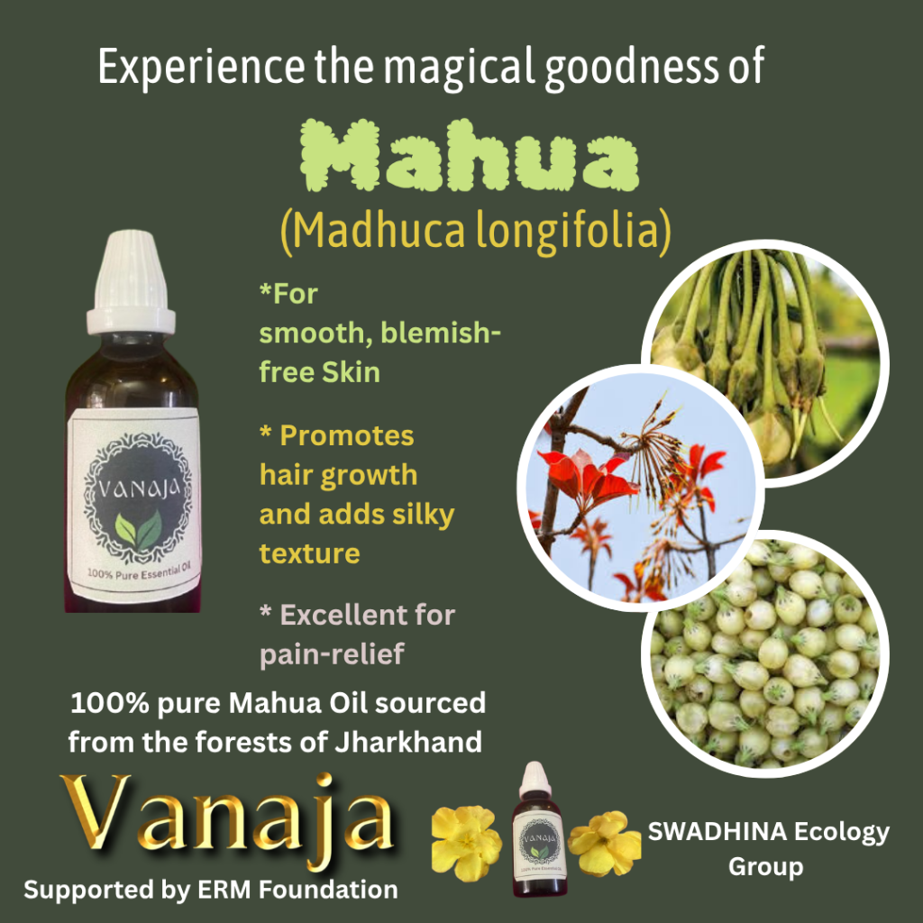 Mohua( Madhuca longifolia ) : Mohua is a tree integral to the indigenous heritage of the tribal regions . Jharkhand has extensive presence of Mohua tress . This tree bears pale yellow flowers that let out intoxicating sweet smell . Blossoming occurs from late February to end of April . The fruits of Mohua trees are yellow and are a source of Mohua oil that impart a wide variety of benefits . Mohua oil can be used mixed with other carrier oils such as coconut or olive oil for the skin for multiple benefits . It removes blemishes, it relives skin irritation , it boosts collagen, minimises fine lines and wrinkles. We need to massage the oil gently all over the skin . It works well as a night care routine or for skin massages . Mohua oil is also extremely beneficial for promoting hair growth . It adds shine to the hair . We need to mix a few drops of Mohua oil with Coconut oil and apply it on hair . We can keep overnight , or for an hour or two and wash off with shampoo . Lustrous hair is guaranteed. One of the prime benefits of Mohua oil is for pain relief because it contains strong anti-inflammatory properties . It not fights against inflammation but also reduces joint pains and body aches . We can apply a few drops of Mohua oil on affected areas and massage very gently for a few minutes and leave it on . Vanaja proudly presents 100% pure Mohua oil extracted physically through the indigenous extraction method to retain its natural goodness . You must definitely keep a bottle of Mohua oil for such multiple benefits.